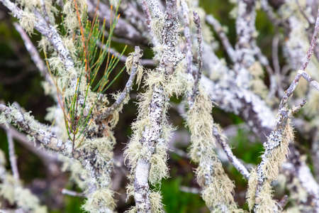 Tiny pin-like fungi or lichen growing on shady bank in close-up micro-landscape on New Zealand West Coast.