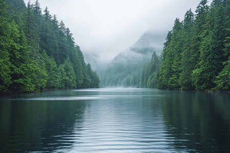 A serene lake with misty edges and soft grey tones, creating tranquil atmosphere