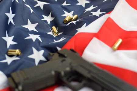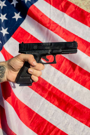 A pistol on the American flag. Gun laws in the USA. Handgun, self defense.