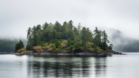 an island emerges from the misty waters, adorned with lush trees. this captivating photo, captured with the fujifilm x-t4, showcases the essence of native american, first nations, and alaska native art. the color palette of light green and gray evokes the beauty of scottish landscapes, while the coastal and harbor views add a touch of rugged charm. the clusters of trees create a dappled effect,