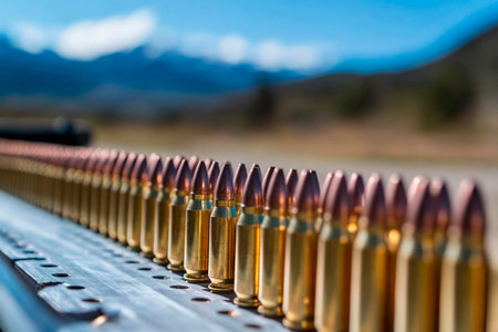 A row of shiny brass cartridges is neatly aligned on a metallic surface at a shooting range.