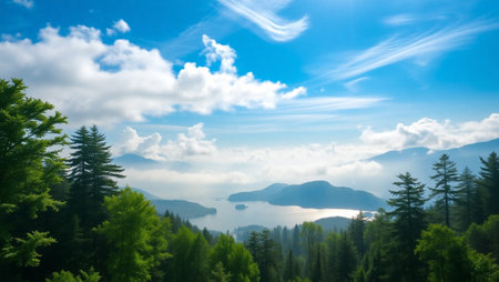 Beautiful mountain landscape with lake, forest and blue sky with clouds