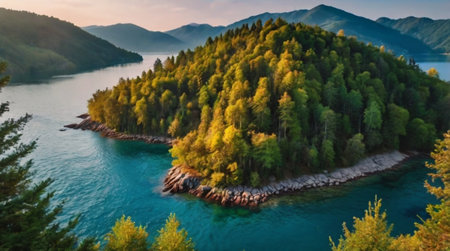 A high angle shot of the sea surrounded by a lot of fir trees and mountains