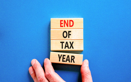 End of tax year symbol. Concept words phrase End of tax year on beautiful wooden blocks. Beautiful blue paper background. Businessman's hand. Business End of tax year concept. Copy space.