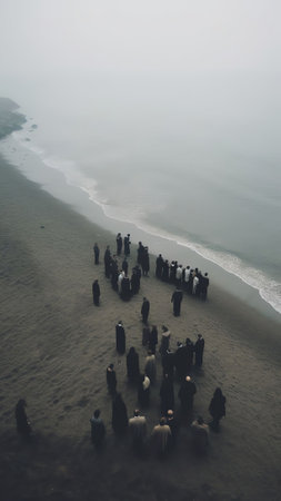 Generative AI : Aerial view of foggy Reyniskirkja church and cemetery in Vk Mrdal Iceland