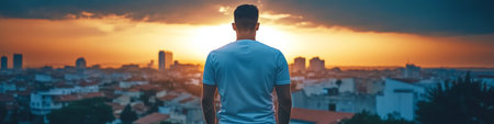 Young Man Contemplating City Skyline at Sunset A Vision of Potential, Ambition, and Urban Living