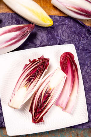 Fresh organic Belgian endivi or red chicory lettuce close up on white plate