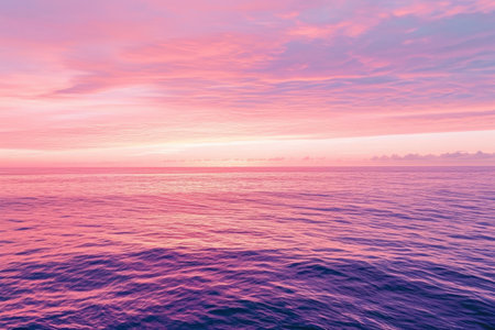 Serene sunset over ocean creates beautiful gradient of pink and orange hues in sky, reflecting softly on water surface, evoking sense of calm and tranquility