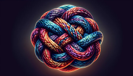 Diverse strands of colorful rope intertwine to form a single, strong knot. This powerful visual represents the concepts of teamwork, unity, and the strength that comes from collaboration and connection. A symbol of solving complex problems together.