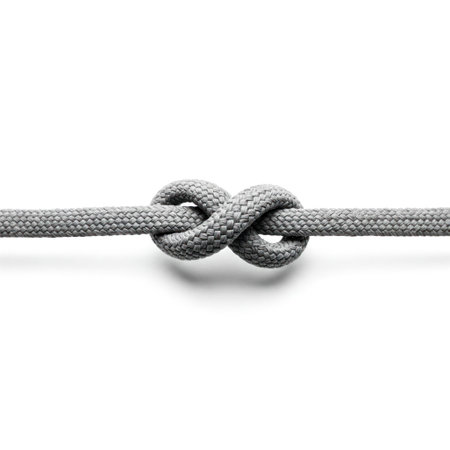 A close-up of a thick, fibrous rope tied into a complex and unyielding knot against a dark background.
