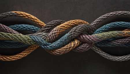 Close-up view of vibrant multi-colored ropes woven together in knots, highlighting texture and unity against a dark backdrop, symbolizing connection and strength.