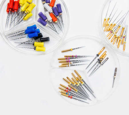 Close-up dental instruments for removal of dental nerves on a white background, selective focus. copyspace