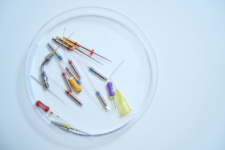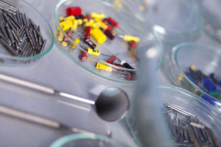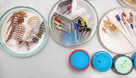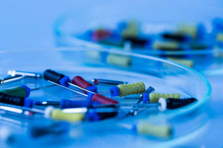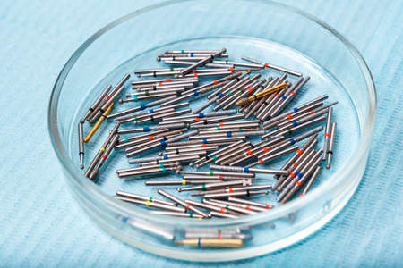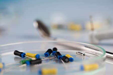 Endodontic Equipment in Petri dish glass closeup.