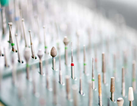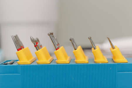 Close-up snapshot of dental nozzles or drill heads for the drill. Dental bur equipment. Selective focus. Dental hygiene and healthcare concept.