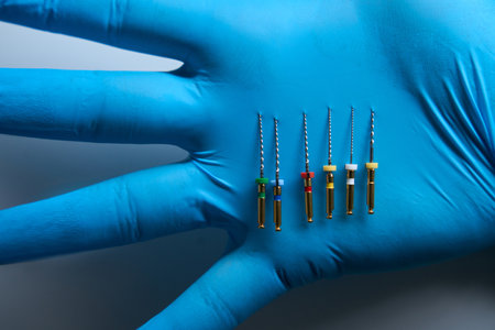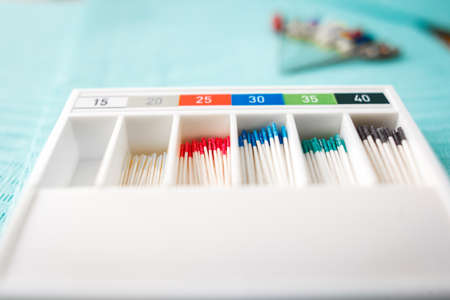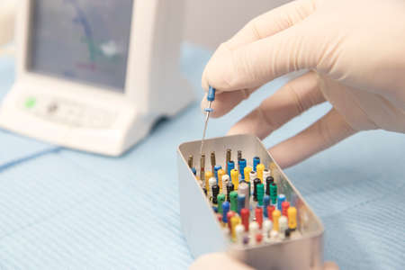 Gloved hand holding probe, dentistry, endodontic boxes with probes. Endodontic Equipment. Tools for dentist work in the root canals of teeth. endodontic file close-up