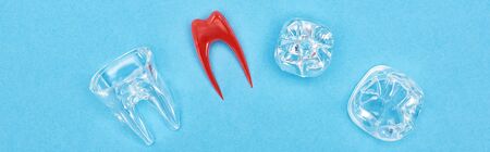 panoramic shot of silicone tooth model near red dental root and tooth fillings isolated on blue