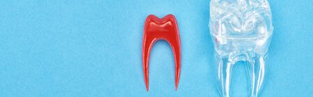 panoramic shot view of silicone tooth model near red dental root isolated on blue