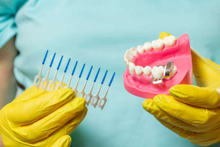 Close-up view of dentist's hands with a human jaw layout and interdental toothpick brushes.