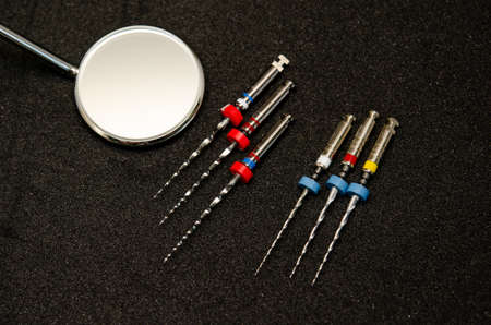endodontic needles for the treatment of pulpitis and tooth roots close-up on black background. Tooth canal instrumentation concept