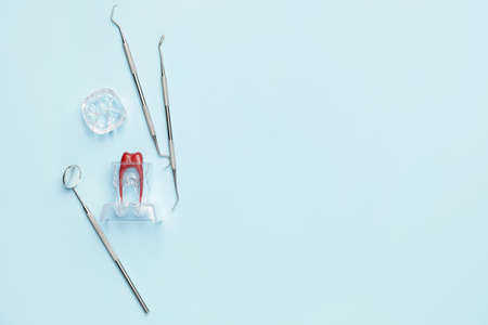 Layout of a human jaw, the dental hole punch, the clamps, the metal frame and the rubber dam forceps on the blue background. Medical tools concept.