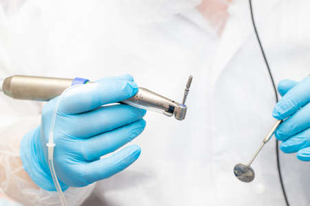A close photo of a hand of a dentist who holds a dental diamond drill in the turbine stainless handpiece.