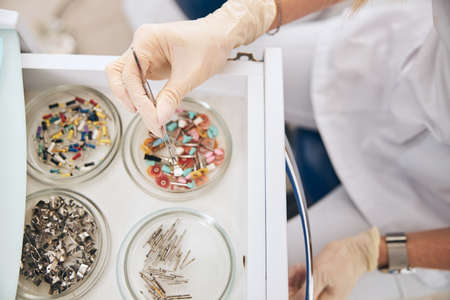 Top view picture of stomatologist that sitting at her workplace while preparing for teeth treatment