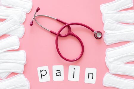 Menstrual period. Gynaecologist and woman health concept with pain word, stethoscope and sanitary pads on pink background top view