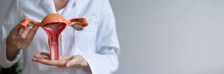 Uterus, doctor holding human anatomy model for study diagnosis and treatment in hospital.