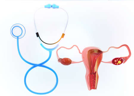 Female reproductive organ with stethoscope on white background. 3d illustration