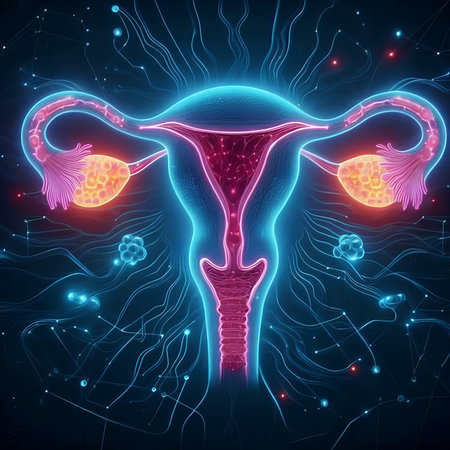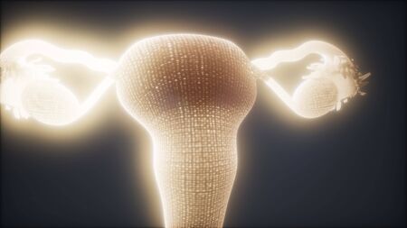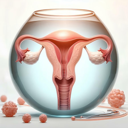 A detailed, realistic anatomical model of the female reproductive system, including the uterus, fallopian tubes, and ovaries, against a neutral background.