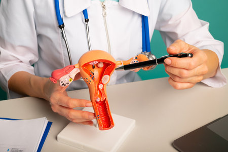 doctor gynecologist pointing model of female reproductive system on his desktop