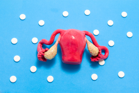 3D anatomical model of uterus with ovaries is on blue background surrounded by white pills as ornament polka dots. Medical concept by pharmacological tableted treating of uterus disease, chemotherapy