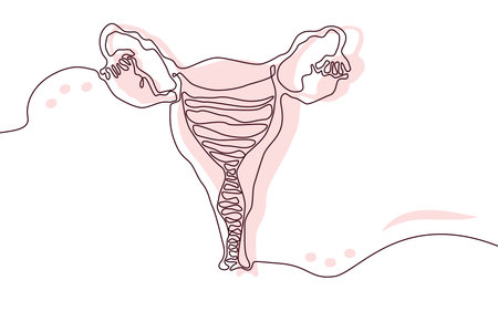 Uterus Hand drawn icon continuous line drawing and pink flat silhouette. Human organs. Medicine trendy concept One single line design. Outline simple image black and white Vector