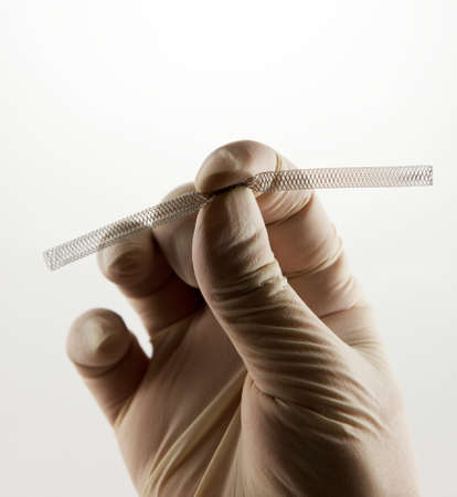 surgeon's hand compressing self-expanding braided nitinol stent for endovascular surgery