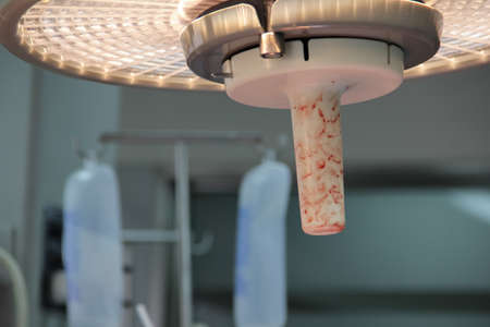 Close-up of operating room lamp with blood and two serums hanging in the background.