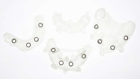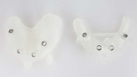 Prototype of human skull from white plastic with titanium implants in form of plates and surgical templates printed on 3D printer. Biointegrated prosthesis. Medicine medical