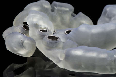 prostheses on titanium bars for the patient's upper and lower jaws, top view on a black background
