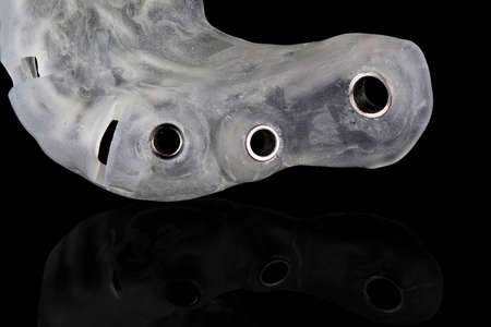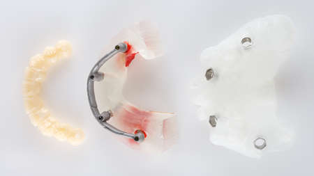Artificial jawbone made of metal. Lower metal bridge with holes for teeth. Process of creating artificial denture. Dental metal plates. Artificial jawbone and teeth. Orthopedic dental designs.