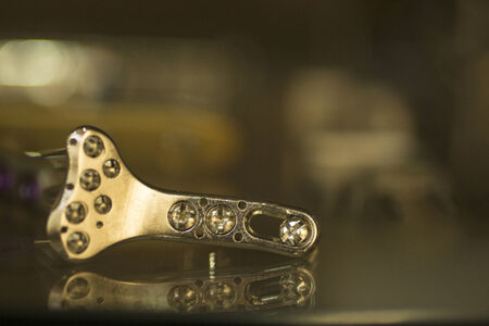 Traumatology and orthopedic injury surgery metal implant with screw heads with reflection and bokeh light effect. Still life color digital photo in brown tones.
