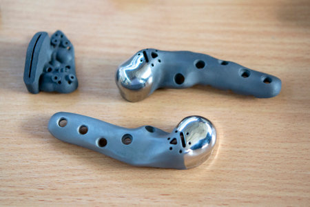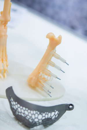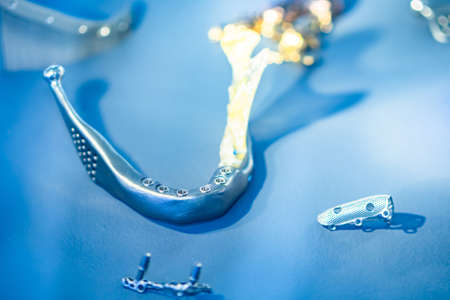 Implants and prostheses printed on 3D printer from biocompatible titanium powder. Jaw fixation plates for human skull. Endoprostheses. Bioengineering