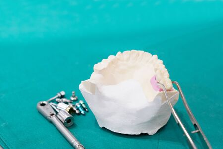 Close-up of the hands of a dentist surgeon on implantation, with dental instrument and surgical template