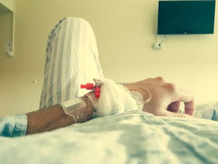 Arm of a male patient in the hospital with an iv intravenous drip