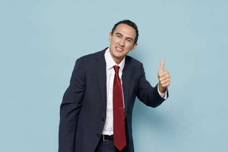Businessman showing thumbs up on dark background, closeup. Space for text