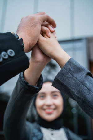 business teamwork Join Hands Support Together showing unity. muslim asian businesswoman partnership