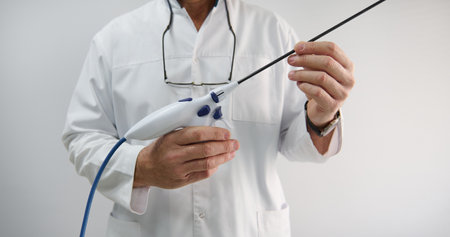 Male doctor holding endoscopic probe in gloved hands ready to start the diagnostic procedure to the patient.