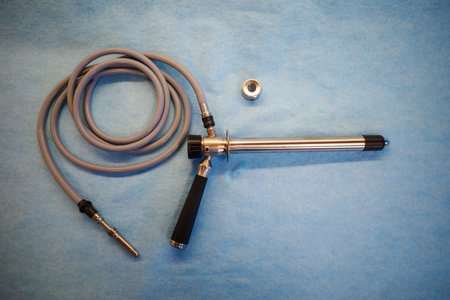 High-quality studio photograph of a medical endoscopic instrument with flexible hose and metal probe placed on a clean blue surgical background. The image shows a professional diagnostic medical device used in clinical examinations, gastroenterology, proctology, or minimally invasive procedures. The sterile composition and clear top-down view make it ideal for illustrating healthcare, medical technology, hospital equipment, diagnostics, and modern clinical practice. Perfect for use in medical education, healthcare marketing, scientific publications, and hospital-related content.