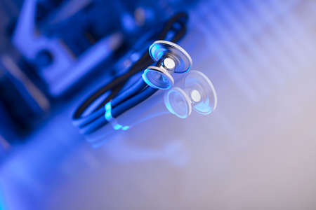 Healthcare, medical concept. Stethoscope, microscope, lab glassware. Blue background.