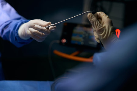A healthcare professional wears sterile gloves while holding a medical instrument, preparing for a surgical procedure in a clean operating room setting.