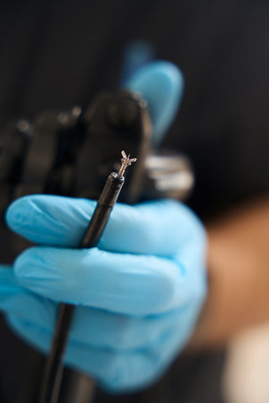 Closeup cosmetologist hands in latex gloves inserting needle into microblading device at beauty salon. Concept of cosmetology equipment for permanent makeup.