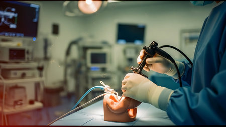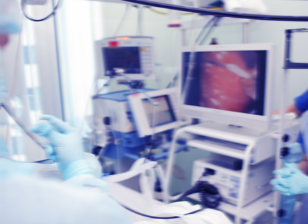 Medical team conducts endoscopic study, unfocused background.